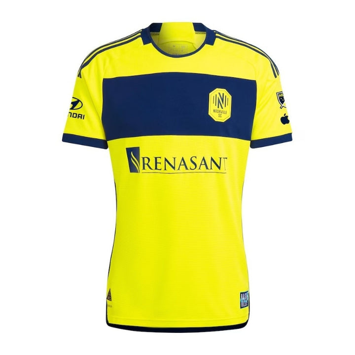 Feel the rhythm of Music City with the Nashville SC Men's Home Soccer Kit 2024-2025. The bold yellow and navy colors, echoing the city's vibrant energy, capture the team's passion and the unwavering support of its fans. This Home Soccer Kit isn't just apparel; it's a symbol of your connection to Nashville SC's growing legacy, a reminder of the electrifying atmosphere at GEODIS Park, and a testament to the burgeoning soccer culture in the heart of Tennessee.