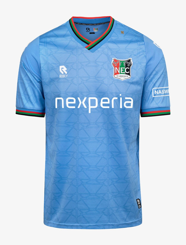 Conquer every away game with the NEC Nijmegen Men's Away Soccer Kit 2024-2025. This jersey isn't simply an alternative; it's a statement of intent, a visual representation of NEC Nijmegen's ambition echoing across enemy stadiums. The striking light blue design, accented with pops of red and black, commands attention, a reminder of the club's unwavering resolve. Crafted from high-performance fabric, this Eredivisie kit ensures peak comfort and breathability, mirroring the team's relentless pursuit of victory, even on unfamiliar turf. Whether leading the chant or dictating the play, this NEC Nijmegen away kit is your armor, your muse. It's more than a uniform - it's a testament to your unwavering support, a promise to stand with the team through every challenge, every triumph.