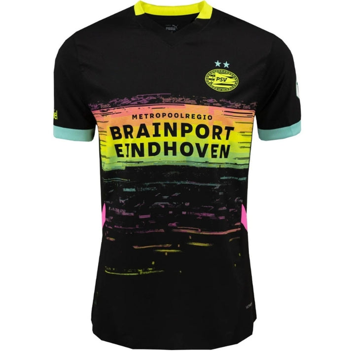 Conquer every away game with the PSV Men's Away Soccer Kit 2024-2025. This jersey isn't simply an alternative, it's a statement, a visual echo of PSV's ambition reverberating across enemy territory. The striking "midnight navy" design, a nod to Philips' innovative spirit, commands attention, a reminder of de Rood-witten's unwavering resolve. Accented with vibrant color blocks inspired by the iconic test card, this Eredivisie kit ensures peak comfort and agility, mirroring the team's relentless pursuit of victory. Whether you're leading the chant or dictating the play, this PSV away kit is your armor, your muse. It's more than a uniform - it's a testament to your unwavering support, a promise to stand with the team as they chase glory on every stage.