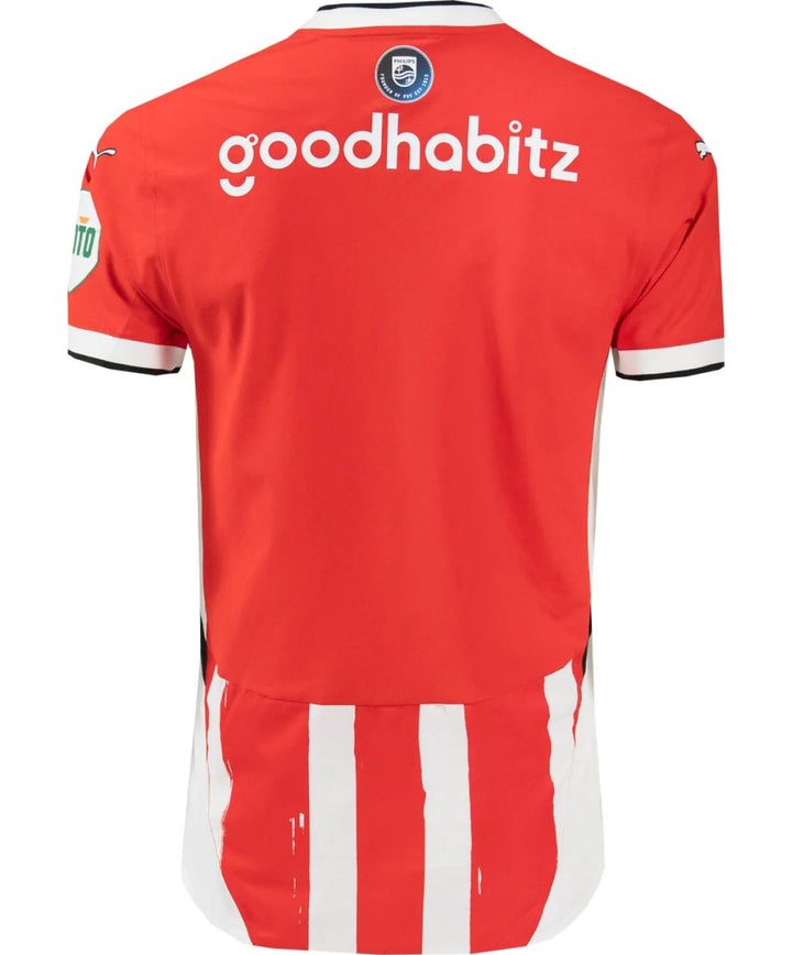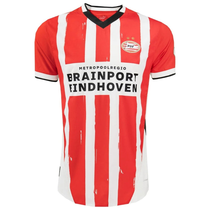 Embrace the legacy of champions with the PSV Men's Home Soccer Kit 2024-2025. This jersey isn't just a uniform, it's a canvas painted with the heart and soul of Eindhoven. The iconic red and white stripes, a symbol of PSV's relentless pursuit of excellence, are reimagined with a bold black addition, embodying the club's modern dynamism. Crafted from cutting-edge fabric, this Eredivisie kit ensures peak performance, mirroring the players' tireless dedication on the pitch. Every detail, from the embroidered crest to the subtle stitching, whispers tales of triumphs and trophies. This isn't just about wearing a shirt, it's about carrying the weight of expectations, the roar of the Philips Stadion, the indomitable spirit of PSV Eindhoven. Whether you're battling on the pitch or cheering from the stands, this PSV home kit is your badge of honor. It's more than a jersey - it's a symbol of your unwavering allegiance to the Rood-witten.
