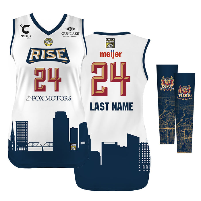 The accompanying arm sleeves provide added support and warmth for your arms, featuring the team name "RISE" and logo. Wear this set to show your unwavering support for the Grand Rapids Rise and enhance your performance on the court.